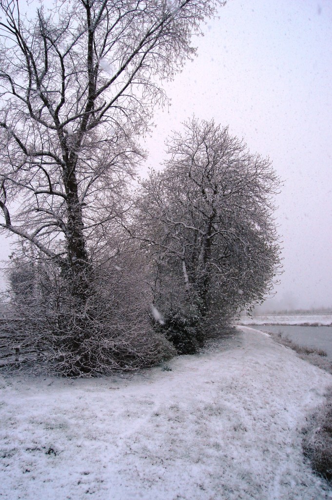 Just as we were all pulling in to the Maidenhead Town Hall car park at 6am, it started to snow. And it continued to snow all morning, so the walk turned out to be like rambling though fairyland. We set out along the river in the misty grey dawn with heavy snowflakes falling, and as daylight grew the snow continued to build up everywhere – on the trees, the houses, the fields – and on us. There must have been at least 2-3 inches or more on the ground as we tramped across a completely white world. There was no-one else around at that time of the morning – just 11 of us walkers and the odd horse or two that pranced away as we rambled by. It was bitterly cold taking gloves off to take photos, but I blazed away anyway because it was all so beautiful.
