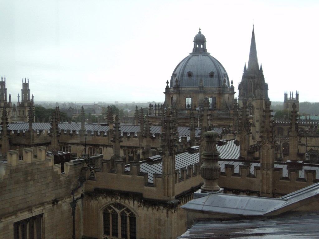 After the walk, I just wandered up and down every street, dropping into every cloister and quadrangle that I could find. Also explored the great church of St Mary the Virgin and climbed up the scary little stone staircase in the bell tower to one of the best vantage points over the city. ‘Dreaming spires’ all around. Dropped into the Ashmolean Museum and also saw an exhibition of John Milton at the Bodleian, but didn’t do the whole tour of either building. Might just have to make a return visit some time.