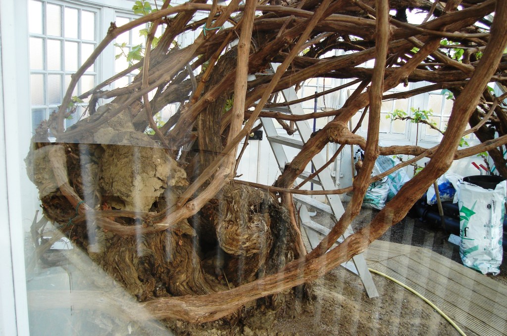 Despite the icy air, I strolled around the gardens and had a look at the Great Vine, one of Hampton Court’s most famous features. This vine was planted in 1768 by the celebrated gardener Capability Brown who designed some of the other great gardens of England. The Vine originally came from a cutting from a French vineyard, and it still produces a good crop of grapes each year, from which they continue to make palace wine.