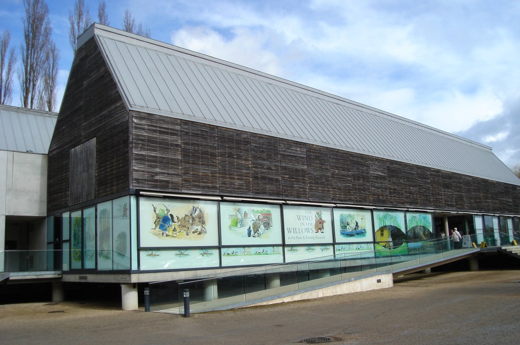 Just walked around the town with its pretty houses and shops, then strolled along the river path to the Rowing Museum. Even the architecture of this Museum is interesting and attractive – a big, rectangular wooden and glass structure … maybe designed to look like a boat shed? The displays inside were fantastic. Firstly, a wonderful look at the history of the river since time began. They’ve found all kinds of ancient artefacts, wooden boats, pottery, stone flints etc in and along the river that tell the story of this waterway since the Stone Age. But there’s also a lot of charming reminders of days not so long ago with all kinds of leisure boats, picnics by the river, angling, stories of the lock-masters and more. I think I’ve developed a special affinity for this part of England (I know … it’s only been 2 weeks …) but I’ve now enjoyed the Thames from many picturesque towns and villages from Windsor to Oxford and still want to see more.