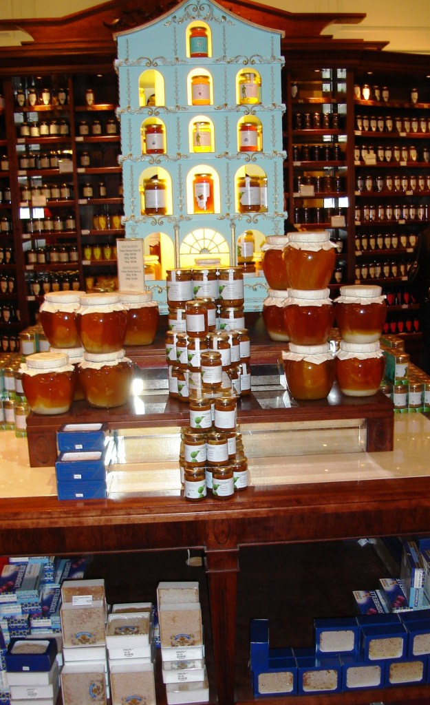 Anyway, on we walked … past Spencer House (the former estate of the Spencer family) and one of the most beautiful houses in London … through little lanes and alleys into exquisite little courtyards of some of the most famous hotels and gentlemen’s clubs … areas that I would never have found by myself. It was like stepping back into the 17th & 18th centuries, with gaslights, secret passageways and more. As the London Walk blurb says “It’s all so well preserved, it’s a wonder the whole neighbourhood hasn’t been sold off as a museum”. We saw the world of Beau Brummel and George IV, the elegant arcades, bespoke tailor shops, shoe-makers and hatters around Jermyn Street, lovely Georgian houses with plaques saying who’d lived there, or who’d done something famous. Then on to Piccadilly, past Fortnum & Masons (Grocers to the Royal Family). Saw the F&M clock chime at midday and the two little figures (Mr Fortnum & Mr Mason maybe?) come out of the clockworks, bow to each other and return. Maybe it all sounds a bit twee back in Oz, but when you’re here, it’s perfect. Into St James church on Piccadilly, then past Hatchards, the famous bookshop where the Royals, the poets, playwrights, lords and ladies have bought their books over centuries… then back around St James Palace and other magnificent stately homes. Following the walk, I continued to float around on my own – down to Buckingham Palace, back up along Piccadilly and Regent Street, in and out of some of the shops and arcades we’d seen with the guide. Hatchards is now my second favourite bookshop in the world (after Shakespeare & Co in Paris) … and I had to buy something in Fortnum & Masons so found the least expensive jar of cherry jam! Felt like a cheapskate, but it IS delicious. All the displays of honey, jam, chocolates, tea etc are so tempting … but at prices like £85 ($190) a kilo for handmade chocolates … I don’t think so.
