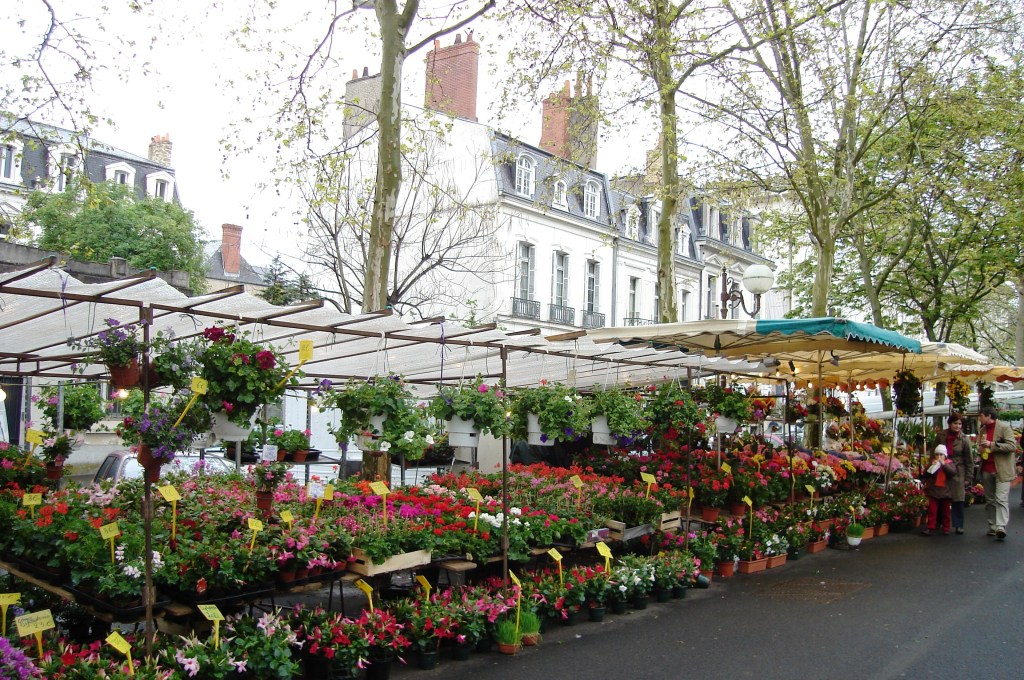 Woke up next morning to light drizzling rain, so changed the plans I’d worked out yesterday with the help of the young woman at the bus station. I’d figured that I could do my own mini-tour of part of the Loire Valley by travelling on the local buses. And this is what I’d intended for today. But with 3 full days still ahead, it seemed silly to spend a whole day around the chateaux in less than perfect weather conditions. Also, when I’d pulled the curtains back in the hotel that morning, I’d found a street market set up in the boulevard below, so this was too good an opportunity to miss. I’d already decided not to have breakfast at the hotel (it cost 6 Euro and I knew I could do better in the local cafes), so I went down to the market and found a cheery little stall selling delicious French crepes. Got chatting to Jacques, the crepe-maker, in very stumbling French with lots of laughs and hand-signs, and he gave me his email address to send him a copy of the photo I took. The other market stalls were selling lovely fresh fruit and vegetables, cheeses and meat. Jacques also told me about the Flower Market on Wednesdays and Saturdays – “tres, tres belles” he assured me … so I made a mental note….