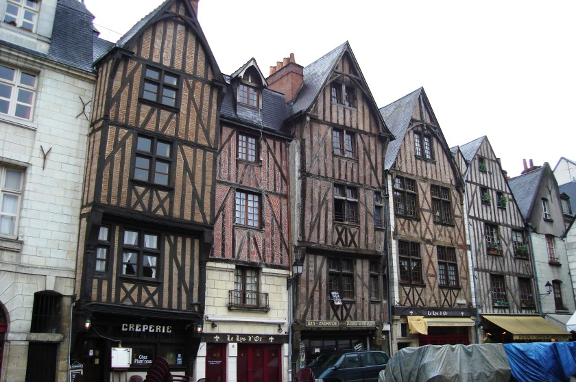 And then it was off to explore for the afternoon. I took the parapluie (umbrella) and toured Tours on foot. Picked up a map at the Tourist Office but ended up just wandering wherever I felt like and came upon the magnificent old Gothic Cathedral of St Gatien (similar to Notre Dame in Paris, I think), also lots of interesting little winding streets, Place Plumerau with its 15th century houses and shops, the huge and fast-flowing River Loire and its lovely riverside walks, attractive shops, the magnificent Town Hall and Palais of Justice, and restaurants, bars and people. Being lundi (Monday), many of the shops were closed. I also learnt during the next couple of days that many also close between 12 and 2pm for lunch every day, and that different areas of the city seem to close either for lunch or dinner … that is, you can’t expect to eat in the evening in an area that mostly serves at lunch time, or vice versa. I’m sure this would all come to be quite natural after a few days, but it took me a while to work out that I could get a glass of wine at a restaurant, but no evening meal, even when they had menus out on the footpath – and that if I wanted the sort of place I was looking for I’d have to walk back to another part of town. However, I do love just strolling around new places soaking up the atmosphere and getting the ‘feel’. On the first day, I think I felt a bit cocooned in my Anglo/Australian identity … possibly how foreigners to our shores feel when they first arrive … a bit nervous about speaking to anyone, taking extra care crossing roads, trying to work out what all the signs say etc. But that soon faded as I learnt my way around. I ended up having dinner the first evening in a restaurant next to the station – with a glass of vin rouge which came chilled. Rather a surprise, and much more delicate than our own full-bodied red wines, I thought.