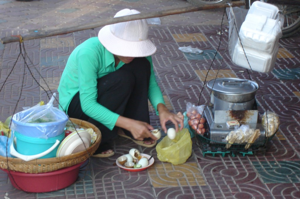 The restaurant we went to last night is a popular place for Cambodian families. It’s a fairly flash “soup kitchen”. There’s a big pot of boiling water in the middle of the table, and dozens of bright little orange-capped waiters and waitresses keep bringing masses of little dishes of noodles, vegetables, fish, meat balls and other things which all get loaded into the big pot to cook, then everybody fishes out a bowl of soup to eat. This continues until everyone is full! Cambodian cuisine is pretty bland compared with Thai and Vietnamese, but this was a fun way to eat and share.