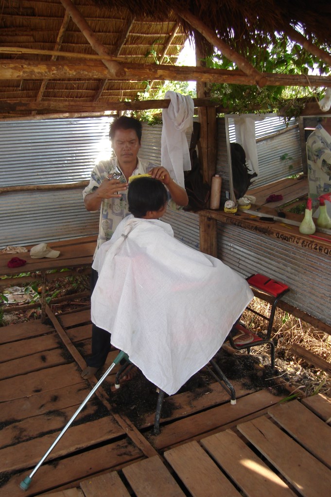 The village seems well-established with a meeting hall, primary school, health centre and little farms and road-side businesses run by the people who live there. They’ve had assistance from a couple of NGO’s over the years and received training in farm skills like keeping chickens, pig-raising, fruit-growing and small business management. We visited a couple of productive little farms and saw how they weave thatch for their roofs, make rice wine, run their little black and white TVs on battery power … all the simple stuff of rural life in Cambodia. We also met the local barber who cuts hair in a little lean-to shelter while his customers sit in a worn-out old chair. He hobbles around on his artificial leg, as do most of the others.