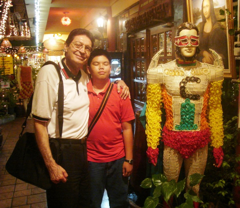 Dinner with Andrew (and his son) last night was at Cabbages and Condoms – an absolute delight and quite a unique place! It’s actually a well-known Bangkok institution, and one that I’d always wanted to try. It’s decorated like a tropical fairyland with thousands of little sparkling lights and lanterns in the garden, and “bushes” and “flowers” made entirely of coloured condoms. There are also statues dressed in condom finery – plus one of the best gift shops I’ve seen in Bangkok. It sells lovely Thai handcrafts and postcards etc, along with all sorts of safe sex placemats, mouse pads, pens and other items … not to mention safe sex aids and condoms of every description. The story behind Cabbages and Condoms is inspiring too …. the founder (a Thai) believed that condoms should be as readily available as vegetables so that people could stay healthy and prevent HIV-AIDS. He started a family planning organisation that now does a range of development work in rural areas. The restaurant is a way of raising money while also promoting the message in an open and fun way.