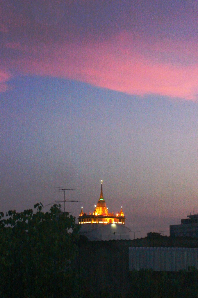 Travelled comfortably and arrived safely. Suvarnbhumi (the new airport) was all glitz and efficiency …. not a yellow T-shirt or protest banner anywhere, though it must have been quite a show here recently when the whole airport was shut down by political protesters. Flight BA10’s load of passengers seemed to move through fairly quickly on Tuesday night, and my cab got me into downtown Bangkok somewhere around midnight. Stayed the first night at the Ambassador Hotel in Sukhumvit and met Andrew, the ABV rep in Bangkok, next morning for breakfast. After the orientation chat, we set off to the apartment he’d found for me – very close to the UN Building where I’ve since started work. The apartment’s quite large and square – basically an L-shaped bedroom / sitting room and a kitchen and bathroom in the other bit. There’s a lovely polished mahogany floor and masses of cupboards …my stuff fills about 1/10 of them. I also have an array of 12 light switches which operate an amazing network of lights over the bed, the table, the TV, each and every cupboard and the little balcony – in addition to the separate kitchen and bathroom lights! Of course I still don’t have the faintest idea which turns on what so there’s usually a mini son et lumiere display every time I want to light up a particular area …. I’m on the 6th floor and look out onto other apartment buildings, clothes lines, mildewed walls and greenery and a patch of cement down below where the local lads play soccer and volley ball. I can also see the huge golden dome of the Golden Mount temple nearby.