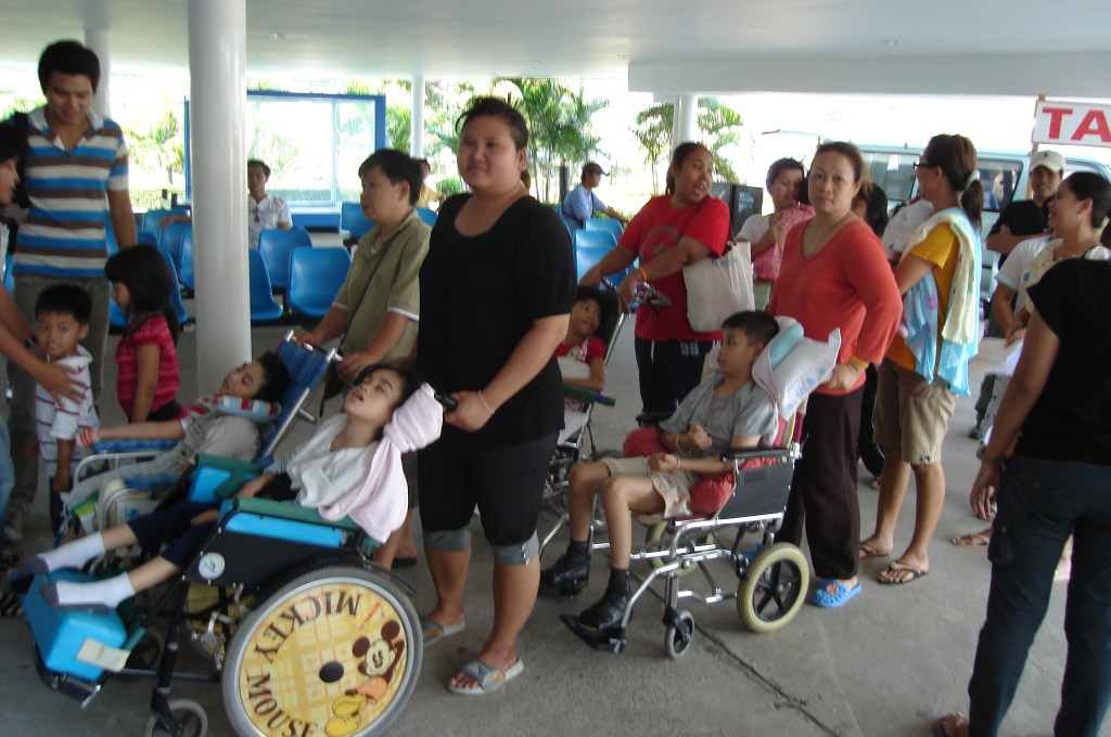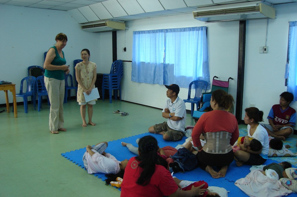 And yesterday I re-met an absolutely amazing young Thai woman, Mae Nok. She’s the mother of a severely disabled little boy, Look Hin, now aged 8. Mae Nok is a tiny person with a huge vision and she’s achieved some truly inspiring outcomes for families of children with disabilities since we first met back in 2002. She told me it was on 17th September 2002 when I first went to FCD (Foundation for Children with Disabilities)– and I spoke to the parents group about respite. She also told me that this inspired her in her dream of creating respite and support services for all families of children with disabilities in Thailand … (it’s things like this make my work here so worthwhile and so very humbling.). And it’s clear that Nok is well on the way to achieving her goals.