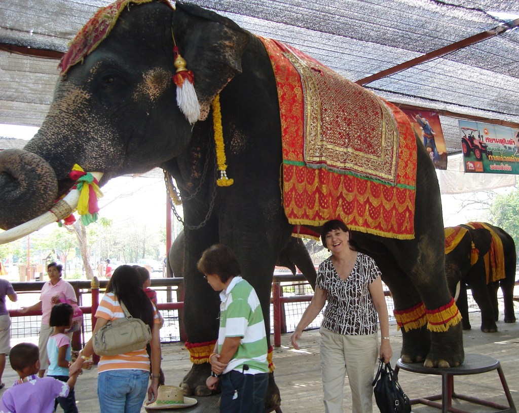 At Ayutthaya yesterday I circled an elephant and walked under him three times. Well … admittedly I did have to pay 20 Baht (about 80 cents) for the privilege, and it was at an elephant show … but it was in the grounds of a temple, and it’s what the legend says, so who am I to argue?? I was taken up to the old city of Ayutthaya by some Thai friends and very much enjoyed the excellent historical museum and all the old temples, as well as the free elephant show. Ayutthaya was once the capital of Thailand – a bit like Angkor Wat in Cambodia. It’s about 2 hours north of Bangkok at the confluence of 3 rivers and is rather a lovely city. The elephants used to be kept by the kings for warfare against the Burmese, Cambodians and other unfriendly neighbouring kingdoms, but now, of course, they wear beautiful red and gold head-dresses and umbrellas and take tourists for rides around the vast temple complex.