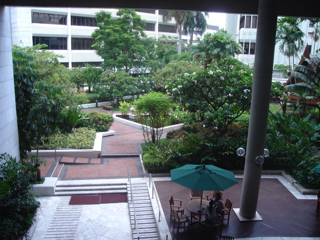 There’s enough furniture to be comfortable (bed, table, chairs, fridge, microwave and small sofa) but no kitchen utensils or other odds and ends provided. However, Ray (from the office) has lent me an electric kettle, and I’ve made trips to the local 7-11 store on the corner, and the market down the road, so am now equipped with plastic plates, a couple of mugs, knife, spoon and a small frying pan. I’ve remembered that there’s really no need to cook when you live in this city … there are dozens of little food stalls out in the streets below, where I can eat well for about $1.50. There’s also a Thai-style coffee shop across the road that makes a semi-reasonable cappuccino. And the UN Building where I’m working has an excellent cafeteria that serves a vast array of very reasonably priced food at lunchtime, as well as other coffee lounges and shops. There’s even a tea/coffee/snack room where the Thai tea-ladies look after the ILO staff.