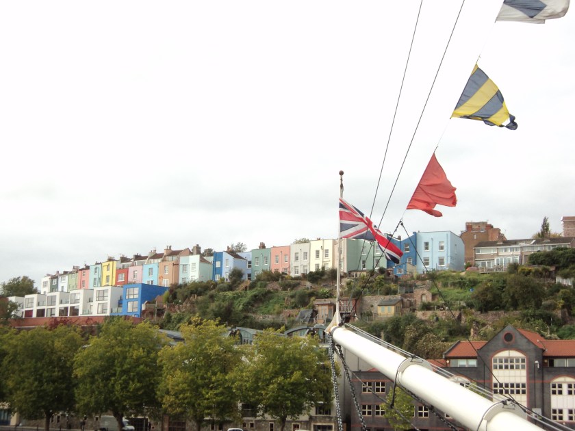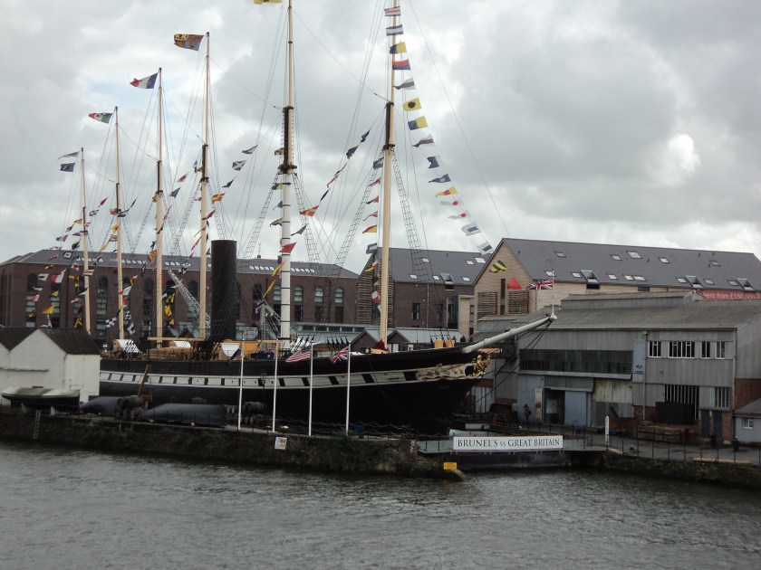 The major draw card for a visit to Bristol has to be the ss Great Britain.   Designed by Isambard Kingdom Brunel, the Great Britain was the first propeller-driven transatlantic steamship, and at the time, the largest ship ever built.   I first came across Brunel when I lived in Maidenhead – he was a great British engineer in the 19th century who built bridges, dockyards, railways and tunnels.  Among many other modern wonders, he designed the Maidenhead railway bridge with the widest single span of any brick bridge ever built.    However, the Great Britain is even more superb, both as an engineering marvel, and for its history.    Built in the Bristol dockyards in 1843, this ship is now back in its home dock after foundering in the Falkland Islands in the 1930s and being rescued and refloated in a mammoth operation in 1970.    It’s a massive iron ship which has been restored and opened to the public as a museum.  You first go down under the glass ‘sea’ to view the hull and huge propeller, then you go on board to see the engines and the passenger decks – splendour in First Class, rather cramped in steerage.  It’s very ‘real’ … even to the extent of onboard smells, from freshly-baked bread in the galley, to sea-sick vomit in the tiny cabins!  The Great Britain transported tons of cargo and thousands of passengers to the colonies, including to Australia during the gold rush days, and she was also used as a transport ship in the First World War    There’s a wealth of memorabilia on display, from passengers’ diaries, to photos, letters, videos of rounding Cape Horn, all kinds of nautical stuff, stories of the Captains, information about the food, on-board entertainment, cargo etc.   It’s wonderful!!