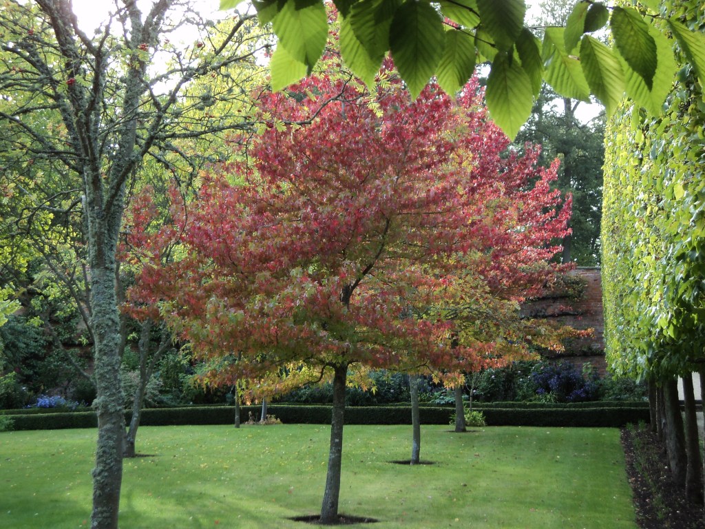The back roads are definitely the way to go to explore this part of the country.  Enticing road signs along the way tempt you to visit other gorgeous villages with names like Much Marcle, Goosey, Hole-in-the-Wall and Wormelow Tump!  But I couldn’t do them all, so just soaked up the beauty of the country all around me.   In some places there are miles and miles of little stone wall fences around the fields, which must have taken years to build in days gone by.   At this time of the year, many of the fields have been ploughed, ready for the winter rains, I expect.   But there’s such variety in the colours everywhere, and something new and lovely around every bend.   One such surprise was Buscot Park, a National Trust property I’d intended to visit some time, but hadn’t got round to looking up exactly where it was.   And here it was on this lovely little back road in the Cotswolds.