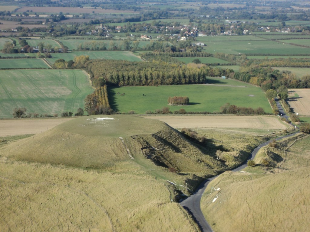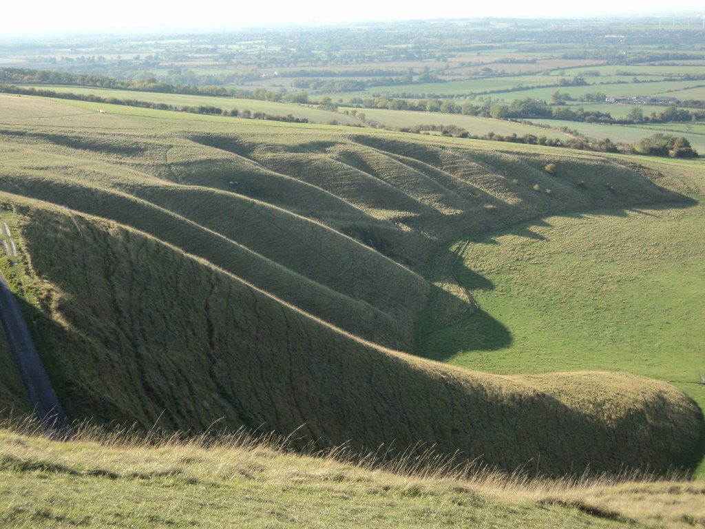 The White Horse on the hill is hard to describe.   It’s a huge, stylised galloping horse flat in the hill, created over 3000 years ago by some ancient tribe who dug deep trenches in the shape of a horse and filled them with chalk.  No-one knows exactly who these people were, but it’s thought that the horse dates back to the Bronze Age.   It’s high on the rolling hills that look over a great expanse of the Downs.  The views from up near the top are magnificent.  But the strange thing is that it’s very difficult to see the full shape of the horse from anywhere below, and even when you get up high and close to it, you can’t see the whole thing from any one single angle.  The only photographs that show the whole horse shape have been taken from the air.   So how did the ancient people make it?   And what is its meaning?    I managed to get a few photos that give some idea of the horse and the surrounding countryside – including the flat-top hill below the horse that has a large white chalk square in the middle, where folk-lore says St George fought the dragon.    It’s a mysterious place, but quite beautiful in the golden sunlight that shone everywhere yesterday.   I realised that if I’d done a bit of preparation before setting off in the car, I could have made a really good day’s walk in this area – there are paths everywhere around these hills, some leading to other ancient sites.  But it was actually quite hot climbing up the hill, so maybe not the best day for a long walk.