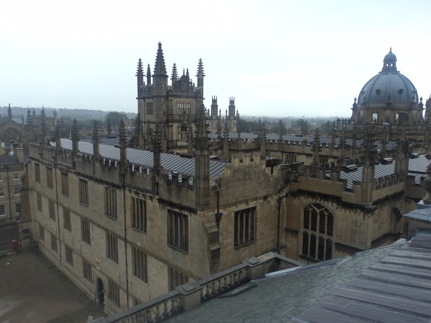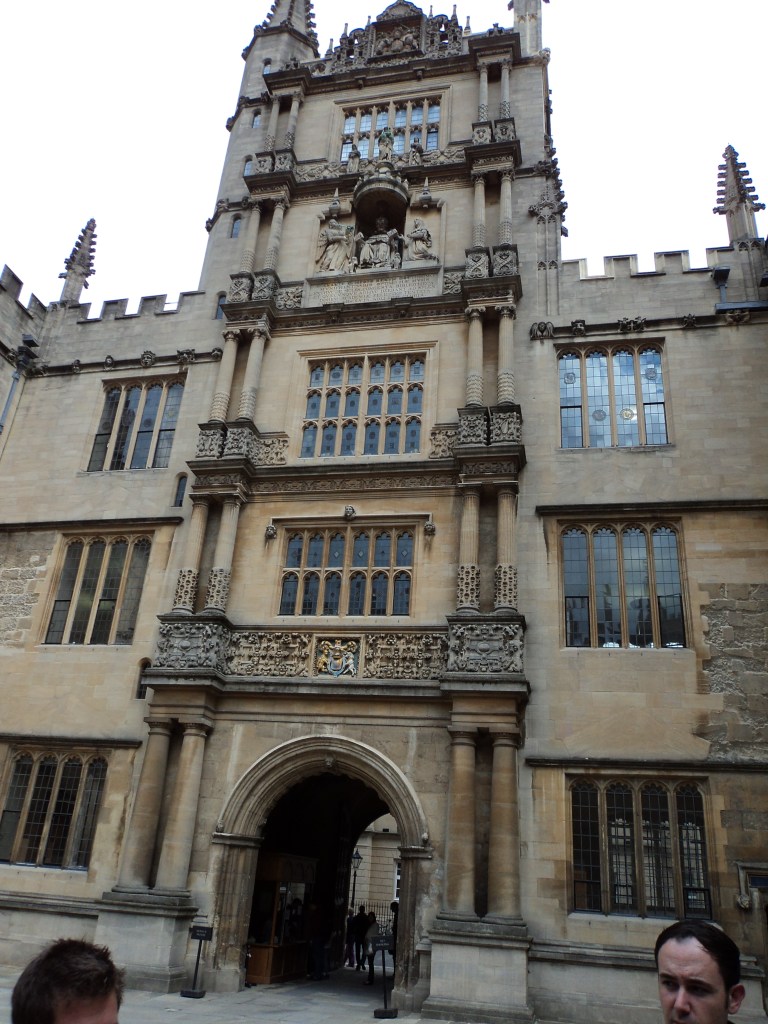 I spent today and yesterday in Oxford, trying to soak up as much of it as possible before having to fly back to Oz.    Yesterday I did an extended guided tour of the Bodleian Library, one of the oldest and most distinguished libraries in the country, founded by Sir Thomas Bodley in 1602.   Monarchs, Prime Ministers, Nobel Prize winners, famous authors and eminent scholars have studied there over the centuries and it has the most wonderful atmosphere of old books, beautiful ceilings and timber nooks and crannies.   The extended tour took in the oldest reading rooms where the library began in the Middle Ages, right through to the newly restored underground tunnel that links to newer sections of the library.  We also visited the Radcliffe Camera which is not normally accessible to visitors.   There are over 9 million books in the Bodleian and vast quantities of other materials such as maps, manuscripts, journals etc.    An added bonus was seeing the current exhibition, titled “Treasures of the Bodleian”.  On display are some of the most precious items held by the library … such as a copy of the Gutenberg Bible, the Magna Carta, ancient maps, a hand-written draft of one of Jane Austen’s novels, a draft of Mary Shelley’s Frankenstein with comments scribbled in the margins by husband Percy, a letter written by Mahatma Ghandi, and a poem by Wilfred Owen with suggestions pencilled in by Siegfried Sassoon.