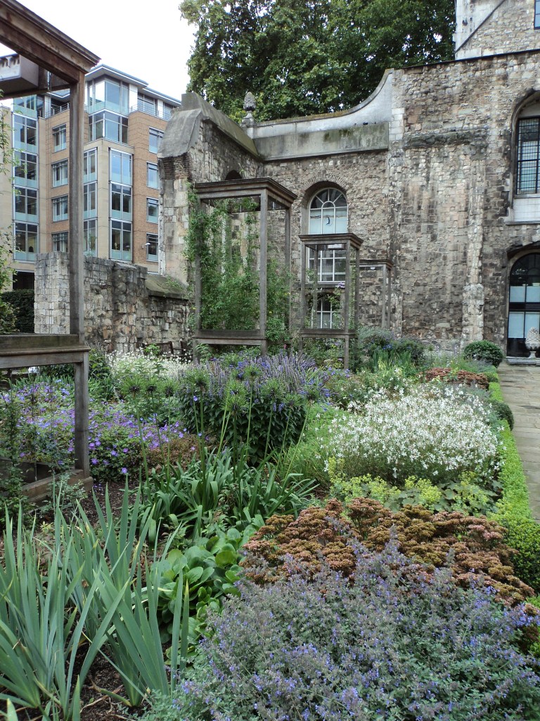 The walk was led by Sally, one of London’s fantastically knowledgeable Blue Guides (and who has also become a good friend of mine in England … we’ve caught up several times since this first walk).  We wove our way around corners and churchyards, between towering city buildings and the rather spectacular Barbican, to find little pockets of gorgeous greenery and flowers where City workers have their lunch and birds and bees try to maintain their way of life in the busy metropolis.   Much of this area was destroyed in the Great Fire of London in 1666, and then destroyed again in the bombing during World War II – but it’s incredible how things re-grow and re-establish.  Many of the gardens are in old church sites that have been protected and all have fascinating stories to tell.   This part of London is also home to the Livery houses – the Goldsmiths, the Pewterists, the Wax Chandlers and all the other trades and industries that made London such a centre of commerce through the millennia.   Sally was a wealth of information about the history, and pointed out dozens of things I’d never have seen of known about otherwise.    It was an extremely interesting walk and well worth the cost of the train fare to get into London (nearly $40 Australian – yes, trains are expensive, even with a Senior Rail Card.)