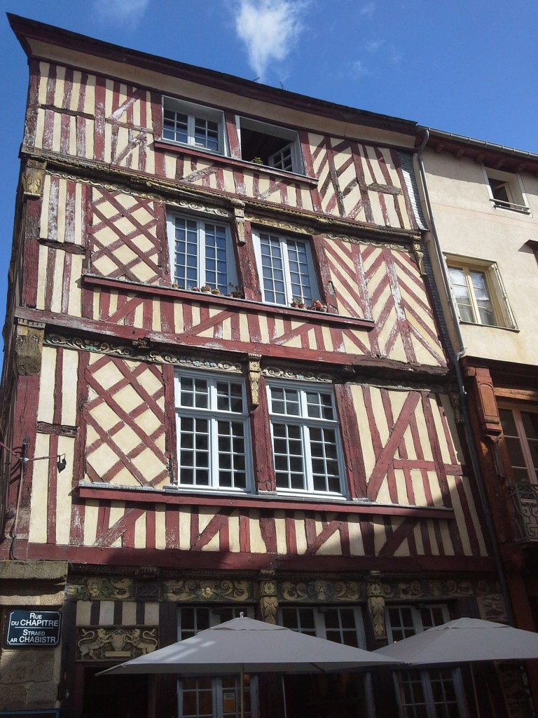 Rennes is an old city, approximately 50 km from Elyane’s home. Today she’d organized for us to meet an official city guide for a walking tour of the most historical parts. We also met Elyane’s brother who came along on the walk. It was fascinating to see the very oldest medieval houses and follow a route through the centuries, with a constant stream of facts and stories….almost entirely in French. Although the guide could speak English, she obviously found it much easier to communicate with Elyane and Christien in their own language, and only gave the occasional brief nod to me in translation. Fortunately the old houses and walls were beautiful to look at, but I had a splitting headache after 2 solid hours of walking in the sun and straining to understand anything. If I ever want to know anything about the history of Rennes from the 13th century I’ll look it up on Google. It won’t be detailed in this here journal.