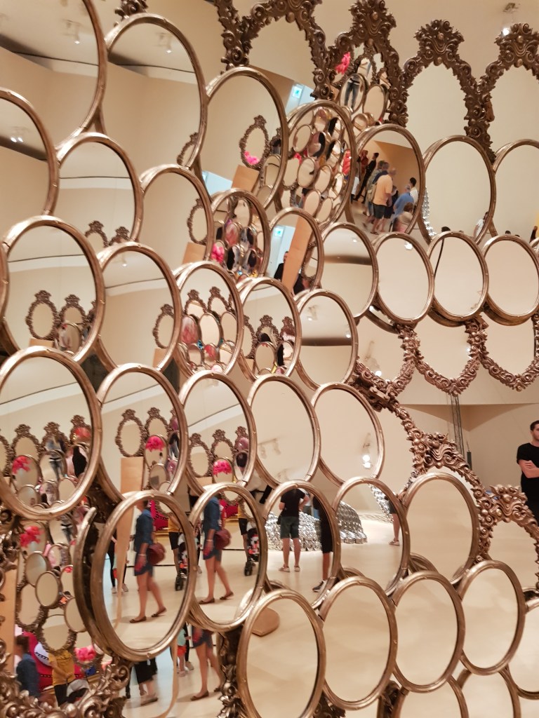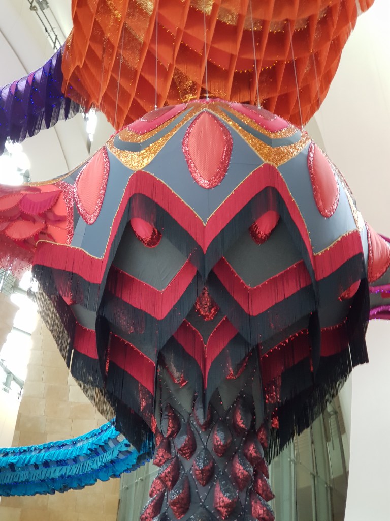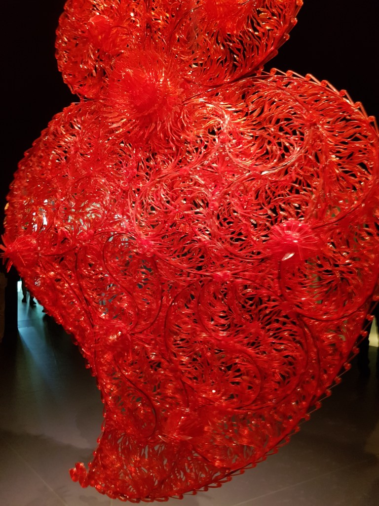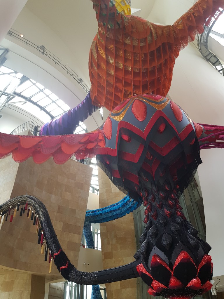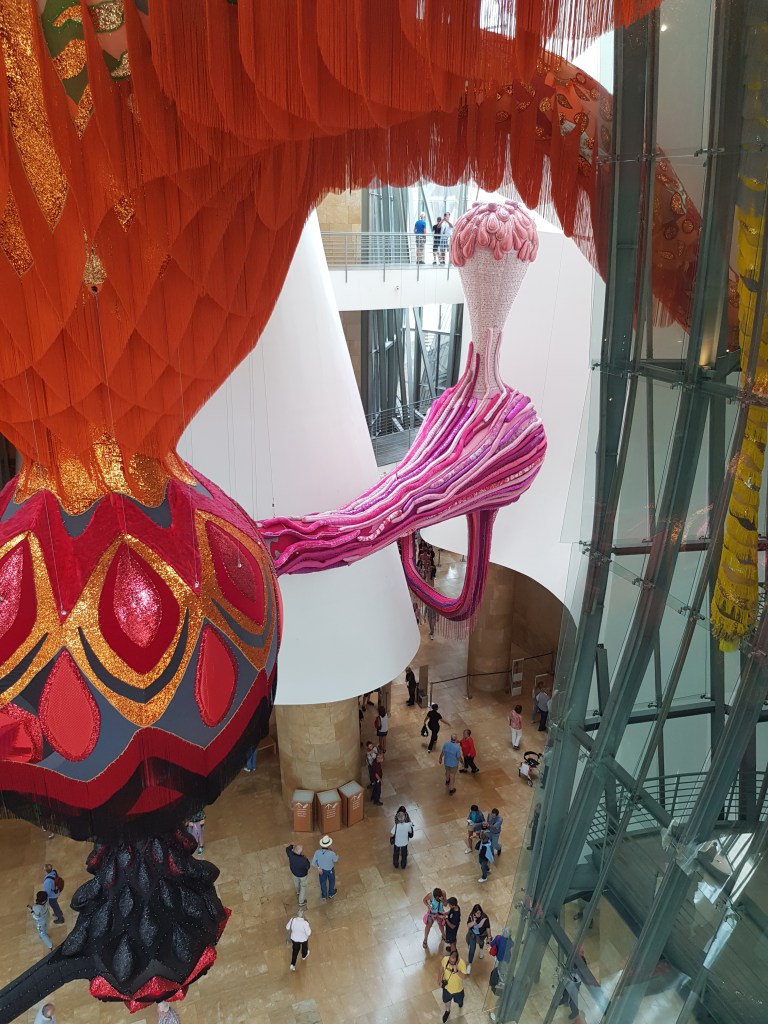 It’s hard to find words to describe the magnificent Guggenheim Museum in Bilbao. Designed by architect, Frank Gehry, the building is awe-inspiring … a huge sculpture-like structure on the riverside. Both the exterior and interior are jaw-droppingly gorgeous, and the art pieces inside and out just add to the wonder. There were several exhibitions available during my visit – one being huge, colourful woollen and fabric decorative sculptures hanging from every level, twisting and linking different points throughout the gallery.