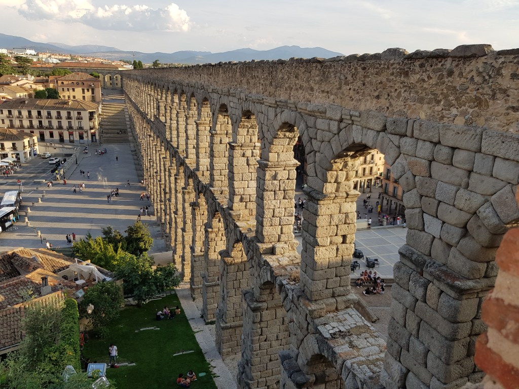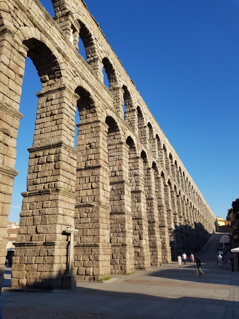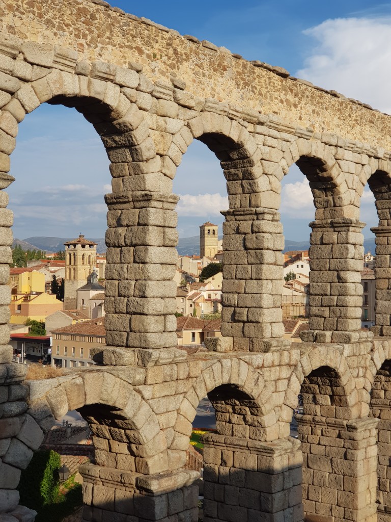 Another fascinating small city and yet another UNESCO World Heritage site… Seogiva is completely dominated by the enormous 2000-year old Roman aquaduct that towers above the main Plaza Azoguejo, and winds its way up and around the old part of town. It has 160 arches, and is built of huge granite blocks. It’s one of the largest and best-preserved aquaducts in the world. It originally carried water from a river quite a distance away …. and apparently is still able to carry water. It’s possible to climb a stairway near the aquaduct to get great views and photos from above.