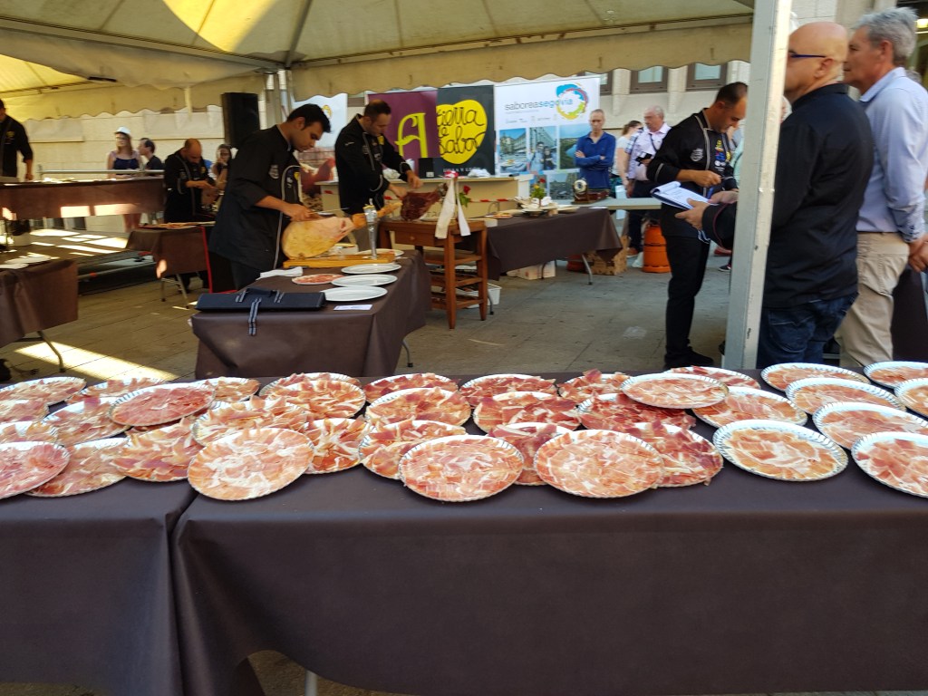 I’d also happened to arrive in Segovia just in time of the Ham Festival! The Spaniards love their ham and regard the whole process of manufacturing, serving and eating it very highly. Sliced wafer-thin, it really is a delicacy … but I never expected to see a whole festival dedicated to it. There were displays of different types of ham (presumably from different types of pigs) and competitions for butchers and waiters in the presentation of it. This all took place in the big square under the aquaduct, with an accompaniment of local bands. Best part was being able to sample small morsels of this tasty treat.