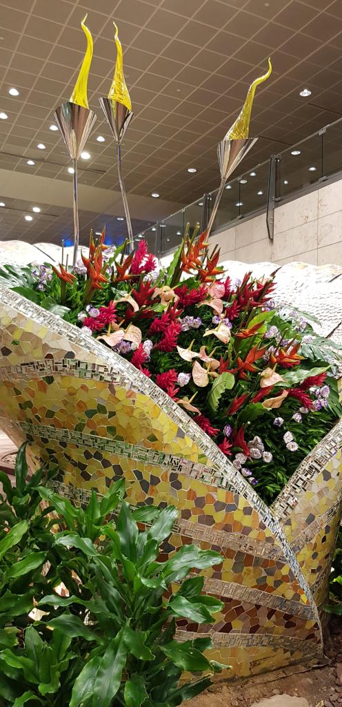Changi airport was very much quieter than usual – and more peaceful and beautiful with fewer people around.   Most of those who were there were wearing face masks. In fact it was easy to spot the Australians and the Brits as we seemed to be the only ones prepared to go full-face frontal.  Even on the plane, the lovely Singapore flight attendants were all masked.  This, combined with my stuffed up head, made it quite difficult to understand anything they said …  eg “ Oools o tata? “  presumably meant “would you like noodles or frittata for breakfast?”.  And “offi-o-t? “ was questioning which drink I’d  prefer.  Not easy….    I also might add here that I don’t think Premium Economy is worth all the extra money.  The seats might be a tad larger, and leg room a bit more spacious, but it was still difficult to stretch out and awkward for the person next to me to climb out and over.  If one has to endure 14 hours of discomfort, one might as well save $1000 and just settle for cattle class as always.