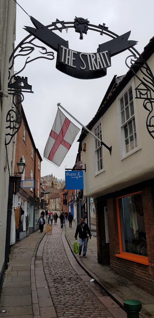 Lincoln Cathedral is massive and dominates the city on top of a very steep hill, opposite Lincoln Castle.   Kings and bishops through the centuries must have basked in their power up there near heaven.  I’m very much looking forward to touring both the Cathedral and the Castle in the near future and learning the history of these inspiring edifices.   Today I just walked (and climbed) and soaked up the atmosphere.  The long cobble-stoned walkway from the commercial part of the city up to the Cathedral Quarter is called .. guess what? …. Steep Hill .  Apparently once voted  as “the best street in Britain”,  Steep Hill really is delightful. As well as challenging!   Tiny shops, tea rooms and galleries line both sides of the narrow street in a mix of ancient buildings.  Picture postcard Britain, for sure.