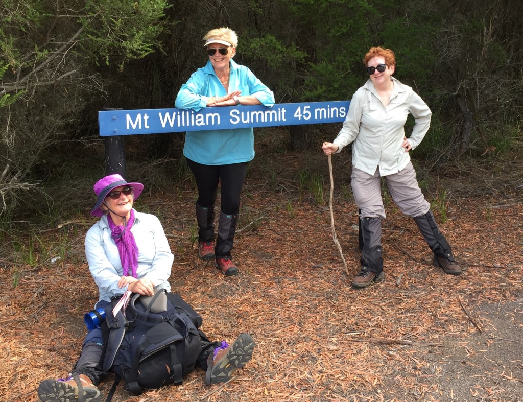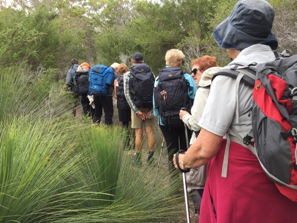 On descending Mt William, the walk took us approximately 12 km through bushland to our first camp. Along the way we saw forests of grass trees (yuckas) and learned about some of the plants that provide indigenous tucker. The going was slow in parts to avoid hundreds of giant webs of the orb spiders. Fortunately, the guides cleared them gently. Snakes were also evident, so we were encouraged to wear gaiters…. just in case.
