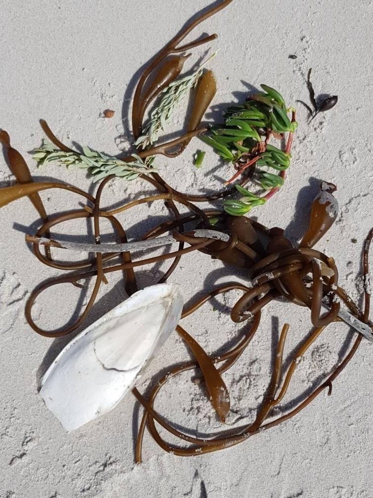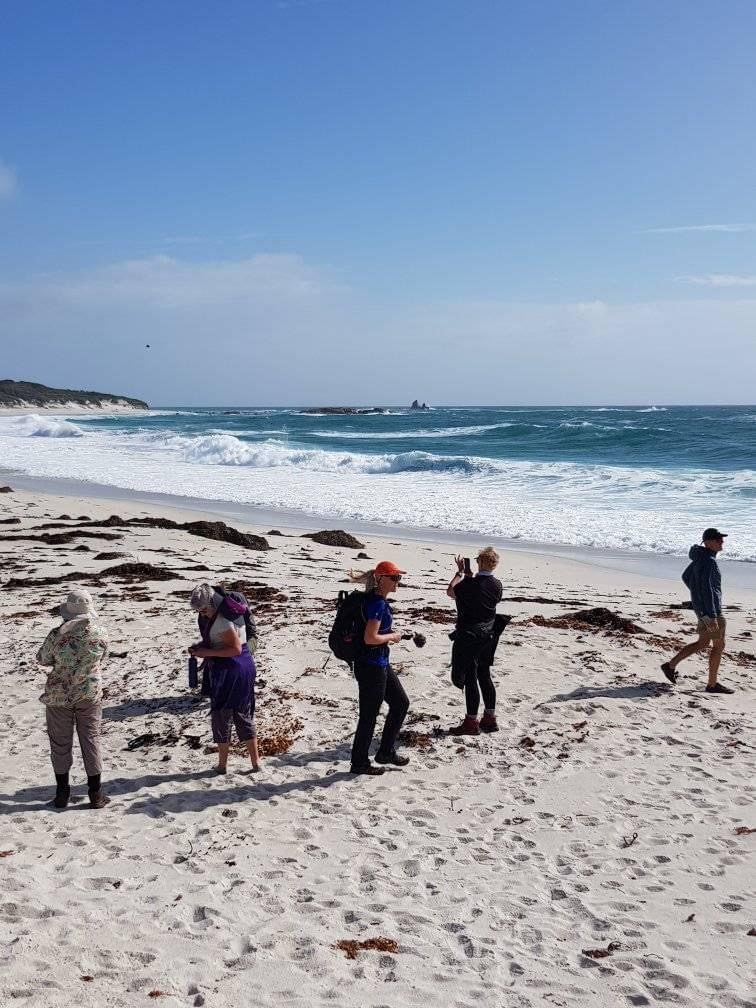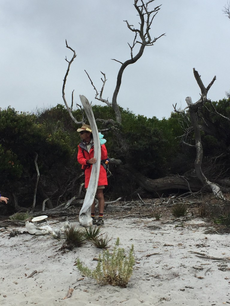 Along the beach, we found sharks’ eggs, shells for making necklaces and strands of huge kelp which was used for basket-making. We were also shown tracks of Tassie devils, wallabies and other wildlife, and advised to avoid the hundreds of blue-bottle stingers that had been washed up on shore.