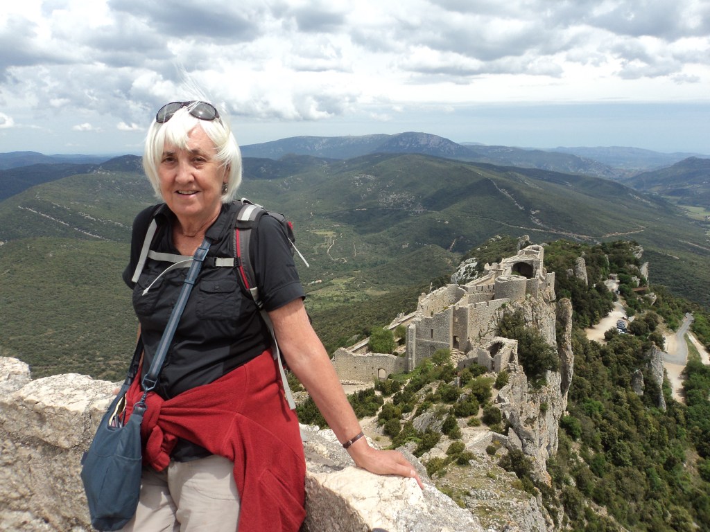 Robert and I climbed to the top of both castles we visited and it wasn’t too difficult to imagine what it must have been like to see huge armies of knights and foot soldiers advancing in the valleys below. But of course all was quiet and peaceful as we sat on a rock and enjoyed our picnic of bread, cheese, tomatoes, olives and wine, overlooking what felt like half of France and Spain. This wasn’t completely my first introduction to the Cathars ….. When we were in Carcassonne, Steve, Helen, Kate and I hired a car for a day and drove to some of the smaller villages that also had a role in the Cathar story. In some places it felt as if not much had changed since the Middle Ages…. an old abbey at Lagrasse, another fortress high on a hill at Lastours and a beautiful bridge and ancient village streets at Minerve. Minerve was once home to a Cathar community, but the entire population was killed by Simon de Montfort in 1210. Modern-day historians have built a model of the deadly trebuchet that was used to pound the village with rocks and destroy the only path the people had to get down to their water supply in the river. Unbelievable, sadistic, power-hungry mania swept across the region until every one of the Cathars had been eliminated. Sadly of course there are more recent, similar atrocities to remember (the Jewish holocaust, Pol Pot in Cambodia, Syria etc) but it remains unfathomable to me how mass murder could have been masterminded on such a scale by the proclaimed head of the dominant church. In the name of the God they believed in. If anyone gets to read this, I urge you to Google the Cathars … and, in particular, have a look at Queribus and Peyrepertuse to learn something of the story and to see how truly beautiful these old ruins are, sited on their mountain tops.