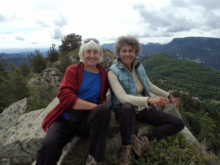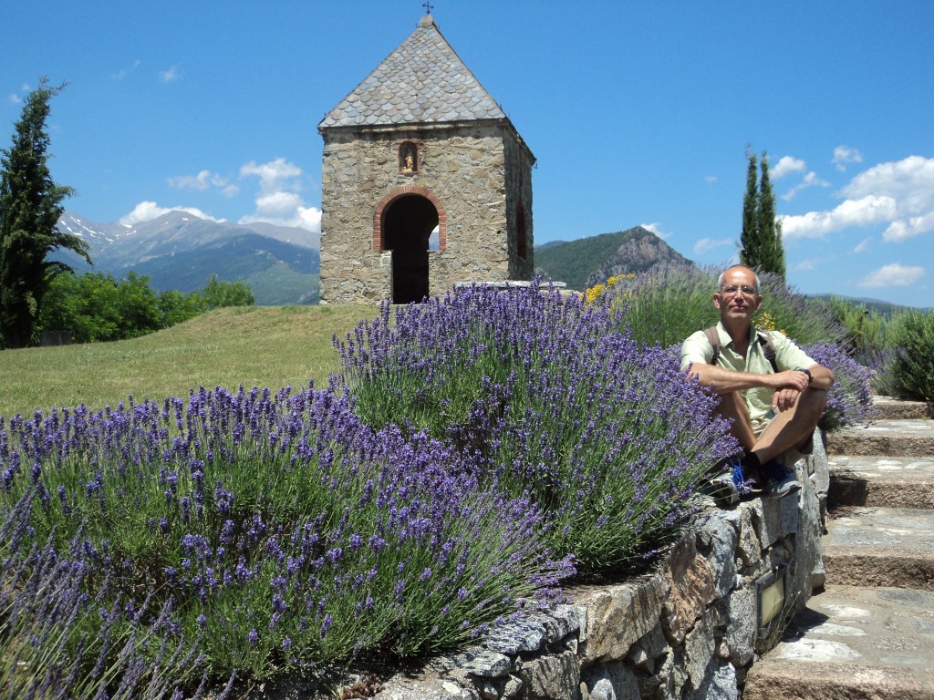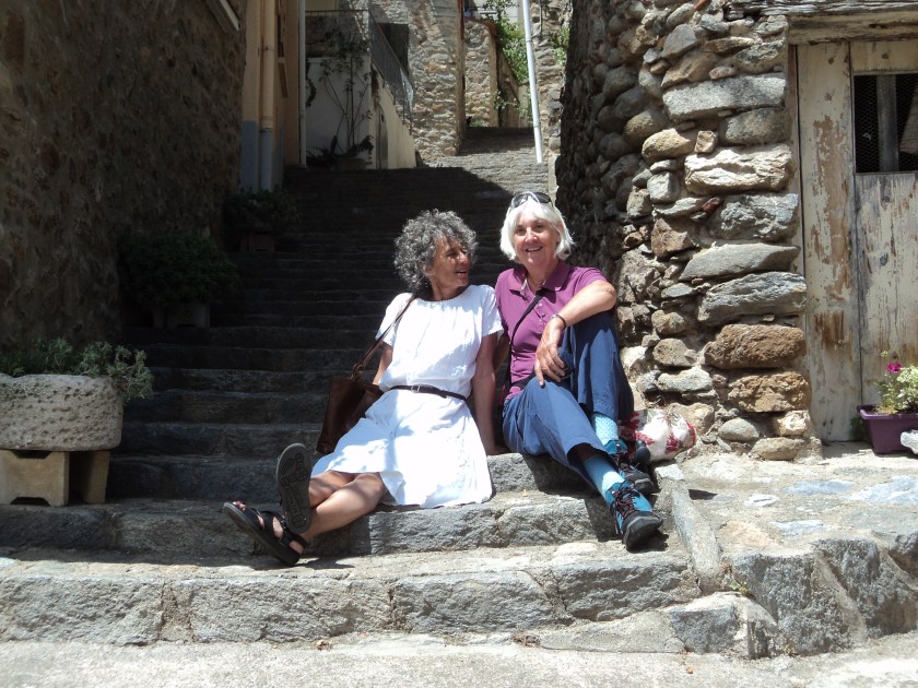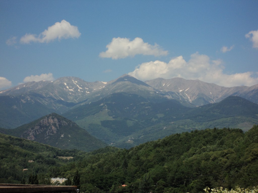 There’s still no word from Jean-Pierre. Jocelyne’s putting on a very brave face and trying to be philosophical but there are still tears from time to time. A day or two before he left, Robert suggested that we all go for a drive to Coursteges, a village almost on the border of Spain, about an hour from here. A tiny place with an ancient Roman eglise (church), a few old graves, typical shuttered houses and a pretty little café/store with a sunny terrace where we had a simple lunch of locally grown chicken, sausage and salad… after we’d climbed one of the mountains. Up, up, up a rocky track and through a forest until we emerged at the top with a view of snow-capped mountains on one side and the Mediterranean in the distance on the other. A lovely place to just sit and share some time. I couldn’t keep up with all the conversation in French, but I think I’m getting better, and Jocelyne and I communicate well enough with her bit of English and my attempts at francais. (Sorry, I just realised I’ve already written about this ….)