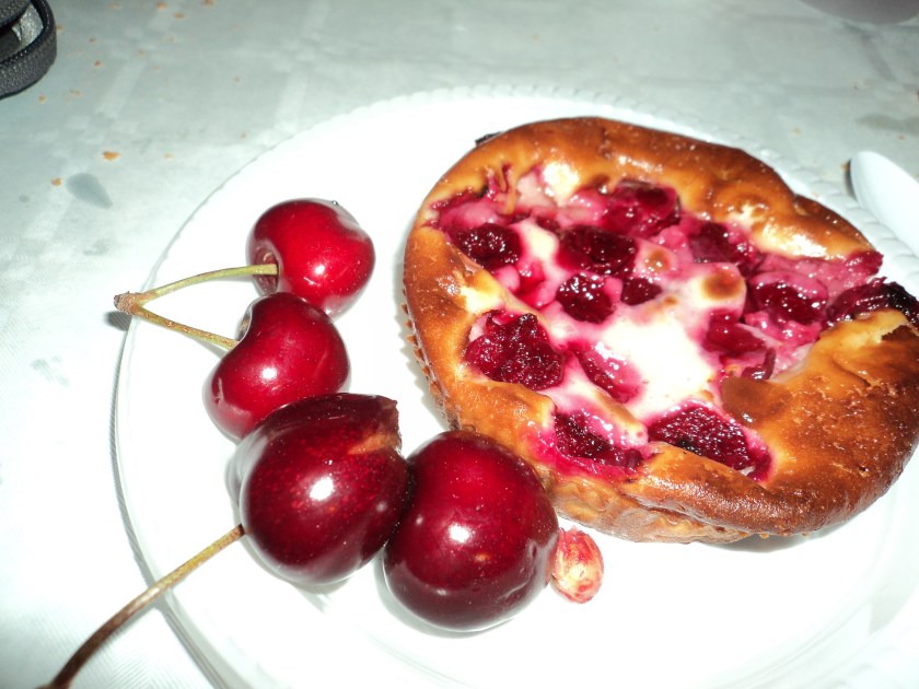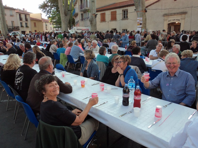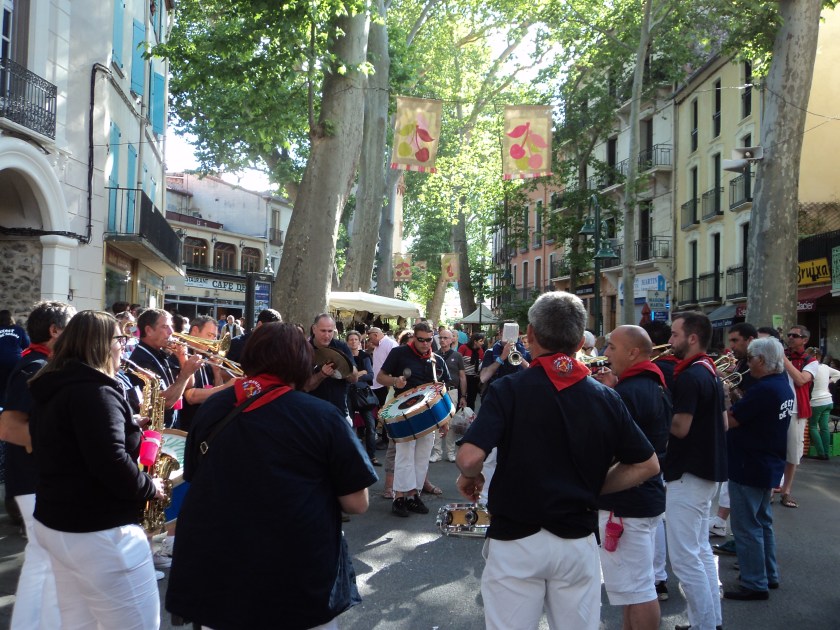 This weekend is the big Cherry Festival in Ceret… markets, music, food, wine and crowds of people. Everything is decorated with cherries and every second market stall is selling them. All the restaurants have menus based around this little red fruit too. I had a fantastic night last night at the huge open-air Festival feast in one of the town squares. There must have been 500-600 people seated at mile-long tables, absolutely filling the square, sharing a great dinner with lashings of wine, armfuls of baguettes and non-stop music, singing and dancing. I went with Sue and Simon, our English neighbours…. they come and stay in their French home just down the road from Jocelyne’s whenever they can… lovely people.