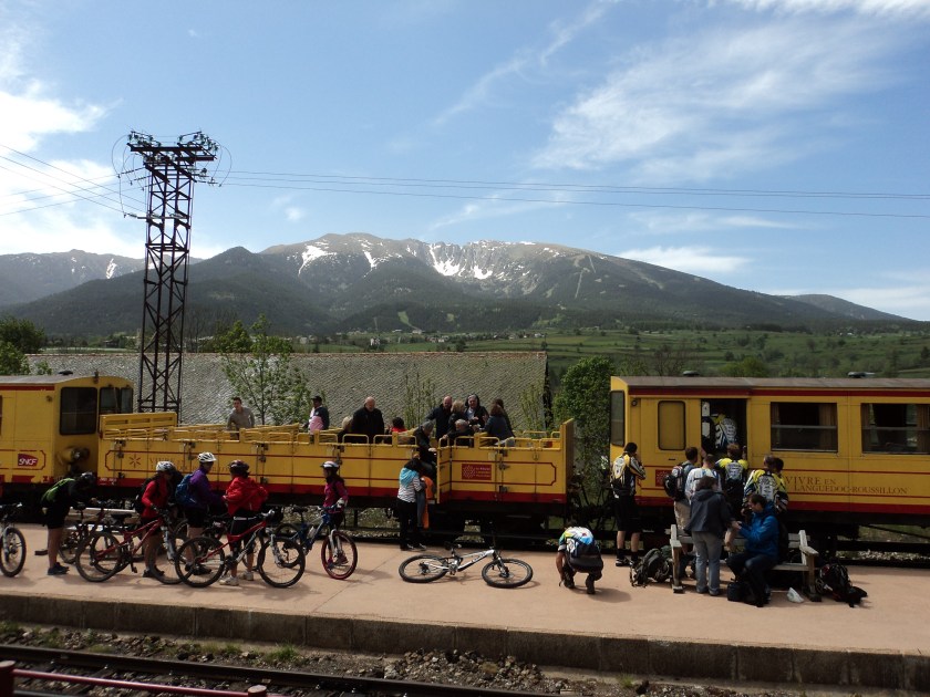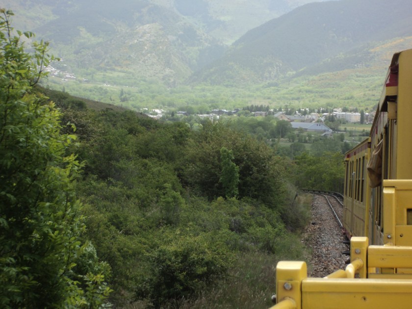 But now back to my travels…… Last Saturday dawned pleasantly up in Mont Louis, but soon descended into a comedy of errors….or got lost in translation somewhere. I’d called into the little tourist office in the old walled town, and had good news to start the day…the little Yellow Train would be running again! Great! After the disappointment of not being able to ride in it the previous day, this was positive. So, with only half an hour ’til the next one was scheduled, I hot-footed down to the station 1km away only to be told by the station man that “non, non” the line was still broken and there would only be “le bus“. Slightly peeved, I resigned myself to wait for yet another bus, when what should rattle into view but a very bright yellow train! I don’t know who had their wires crossed, but clearly there WAS a yellow train going somewhere with a whole lot of people on board. So – who knows or cares where it came from – I decided on the spur of the moment to take a ride further up the line and see where I got to. It turned out to be a pleasant trip for an hour and a half, sitting alone in the open-roofed carriage, surrounded by mountains and valleys, going to La Tour de Carol, on the Spanish border. Unfortunately though, there’s not much to do in sleepy little Tour de Carol on a very hot Sunday afternoon so I mostly ended up waiting, waiting, waiting for a bus to take me down again. But at least when it came, it went all the way back to Perpignan.