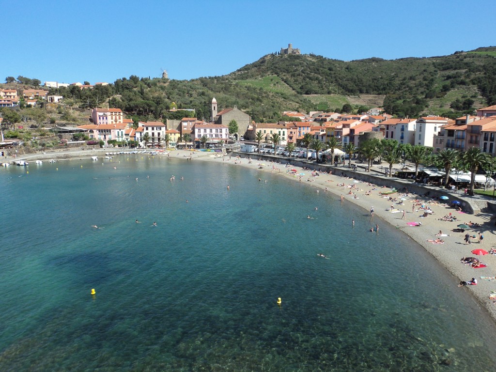 On Tuesday, I took myself to the beach on the bus. Argeles-sur-Mer and Collioure are not far away, but the bus took ages, winding its way through every little village en route. But I enjoyed just going with the flow and exploring Argeles when I got there. It’s a very laid-back south-of-France holiday resort place…lots of tourists, restaurants, shops etc and a beautiful wide beach. No one in the water, but lots of people soaking up the sun. I discovered the next bus would take me onto Collioure, and from there I could get back to Perpignan and on to Reynes. And what an absolute gem I discovered Collioure to be…if anyone is planning a trip over this way, put it on the itinerary. It’s gorgeous…a mix of Crete, the Greek islands and a dash of the Cinque Terre, all sprinkled with French chic. Yes, a bit touristy, but so pretty that you just have to love it. The beach is overlooked by a massive fort/castle and there are great walks all around. The shops have beautiful local arts and crafts, trendy clothes, delicious ice-creams and everything else that makes you feel you’re in a special kind of heaven.