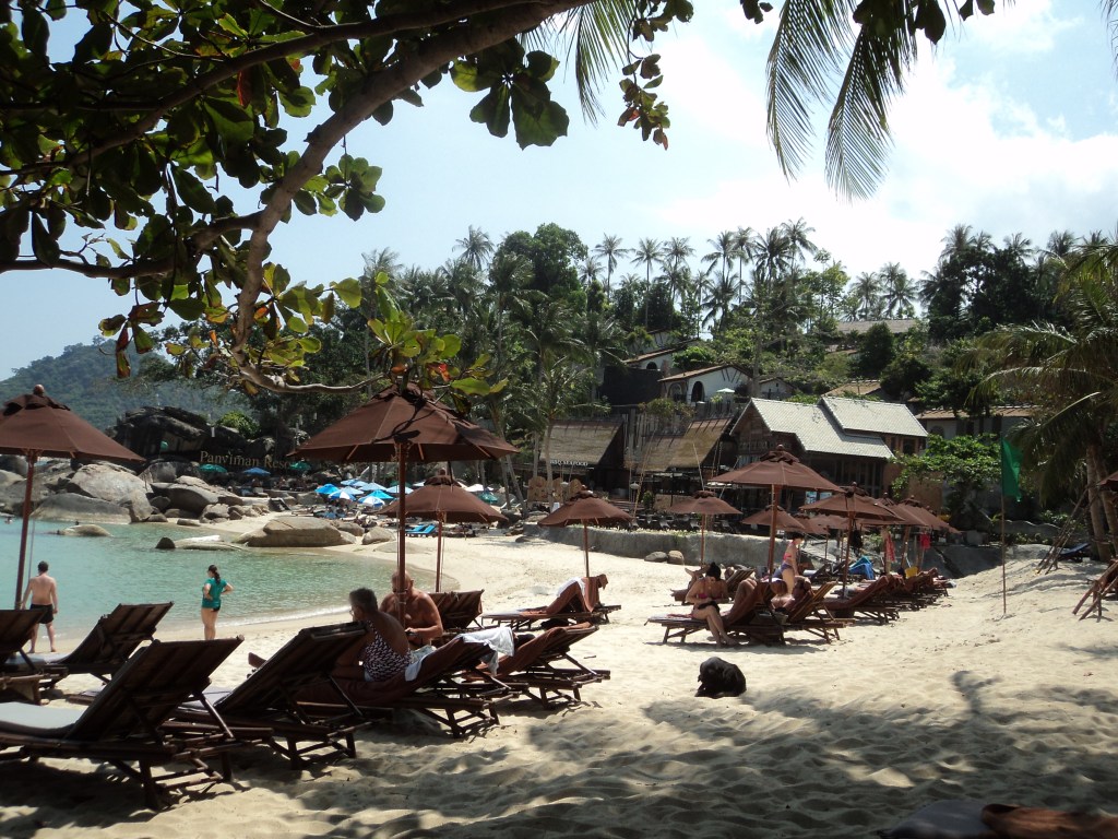 Koh Phangan is a short ferry trip across from Koh Samui, but the beach we were to stay at was at the top of the island, furthest from the ferry port. Mai pen rai …. no worries! Clive rented a small motor bike (like all the farangs/foreigners do on the Thai islands) and we rode up to ‘our’ beach, luggage and all. We seemed to cause a bit of amusement among some of the younger backpacker travellers …. but Clive’s ridden motorbikes around the world, from tip to toe in Africa and all over Europe, so I wasn’t a bit worried.